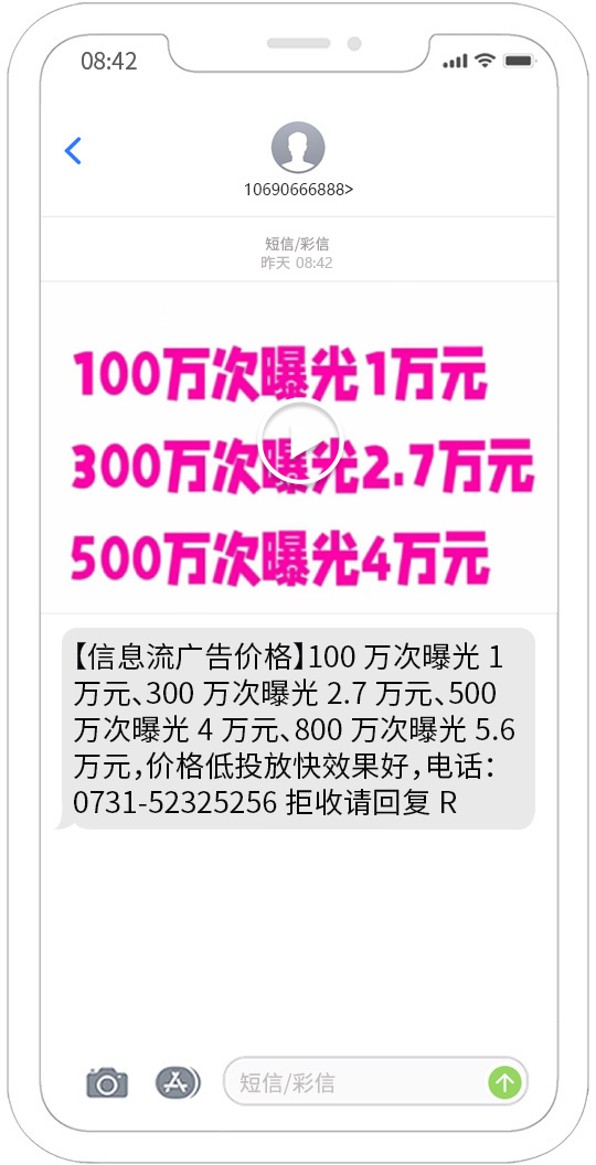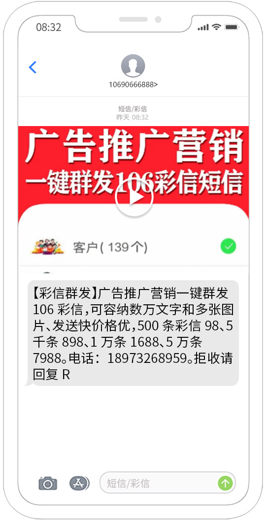 視頻短信發送能夠覆蓋移動、聯通、電信用戶,正規集團視頻短信通道,快速、可靠、穩定、形象好,能快速將您的訊息投放到用戶的手機。